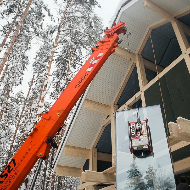 Монтаж стекла с помощью вакуумных захватов компании Арлифт.