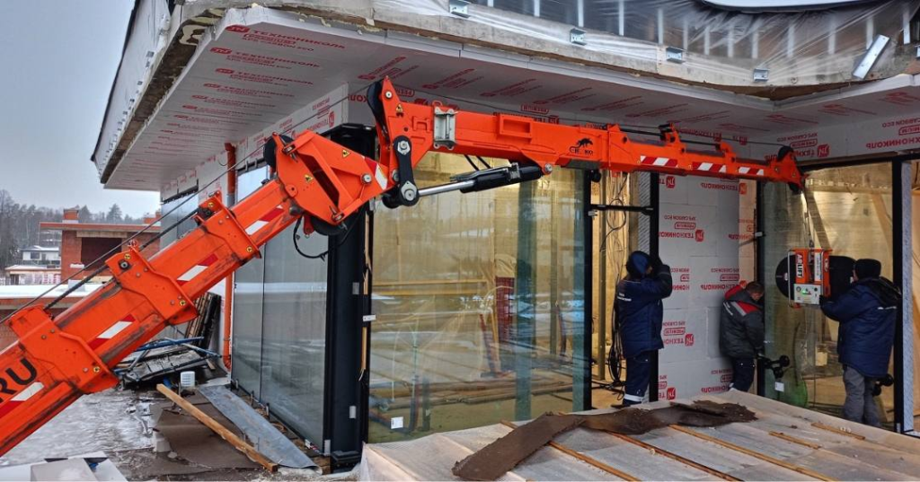 Стесненные условия, деревья с обеих сторон, монтаж на вылете под козырек — и два стеклопакета по 1100 кг каждый. Место для техники было только одно: между деревьями, ниже уровня монтажа.  Мини-кран паук JF545CDH-2 встал именно там. В паре с ним работал вакуумный захват ARLIFTER F/R-2500А. Кран выставлял и удерживал стекло точно по точке монтажа, пока бригада монтировала конструкцию в проектном положении.