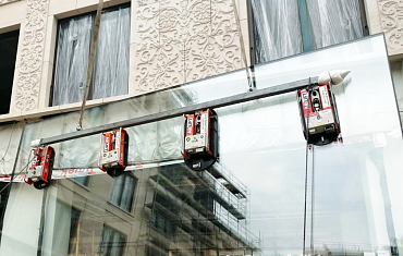 Стеклопакеты весом около 1800 кг установили в одном из строящихся отелей Москвы с помощью четырех вакуумных захватов Арлифт.