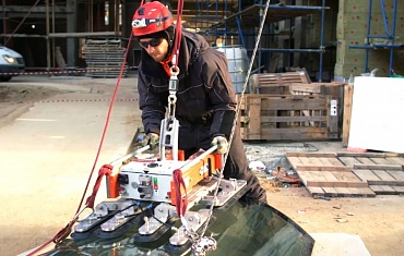 На территории строящегося жилого комплекса происходил сложный монтаж радиусных стеклопакетов с помощью вакуумного захвата ARLIFTER GS-R-600